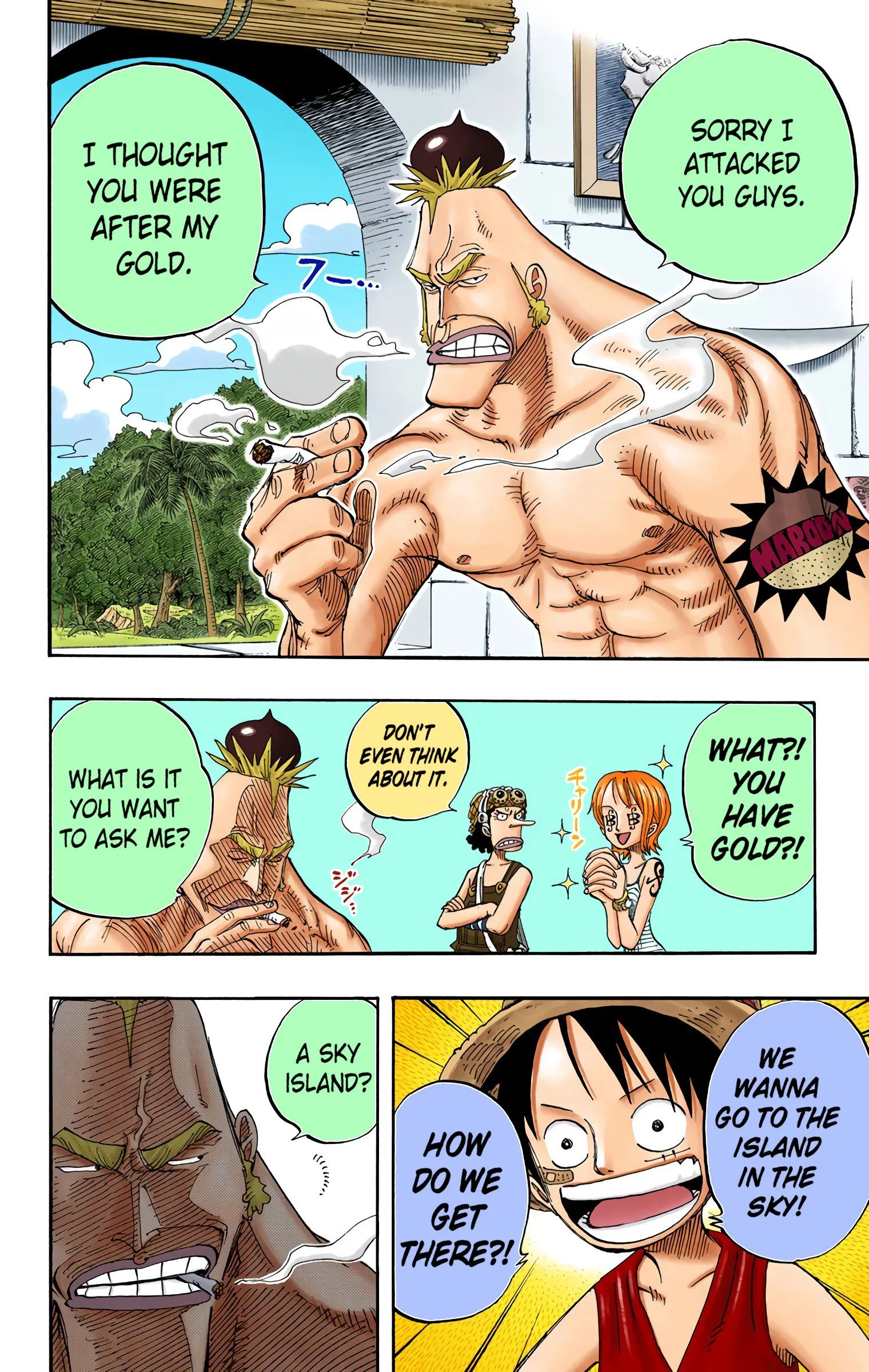 ONE PIECEseason three, “SKY ISLAND”Voyage 1 | Voyage 2 | Voyage 3 | Voyage 4 | Voyage 5 | Voyage 6 | Voyage 7 | Voyage 8 | Voyage 9 | Voyage 10 S1 S2 S3 S4 S5 S6 previous season three, voyage two “The Hundred Million Man” chapters 227 - 2364/22/2002 - 7/1/2002 next previous season three, voyage two next
